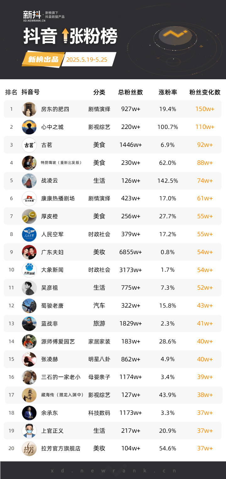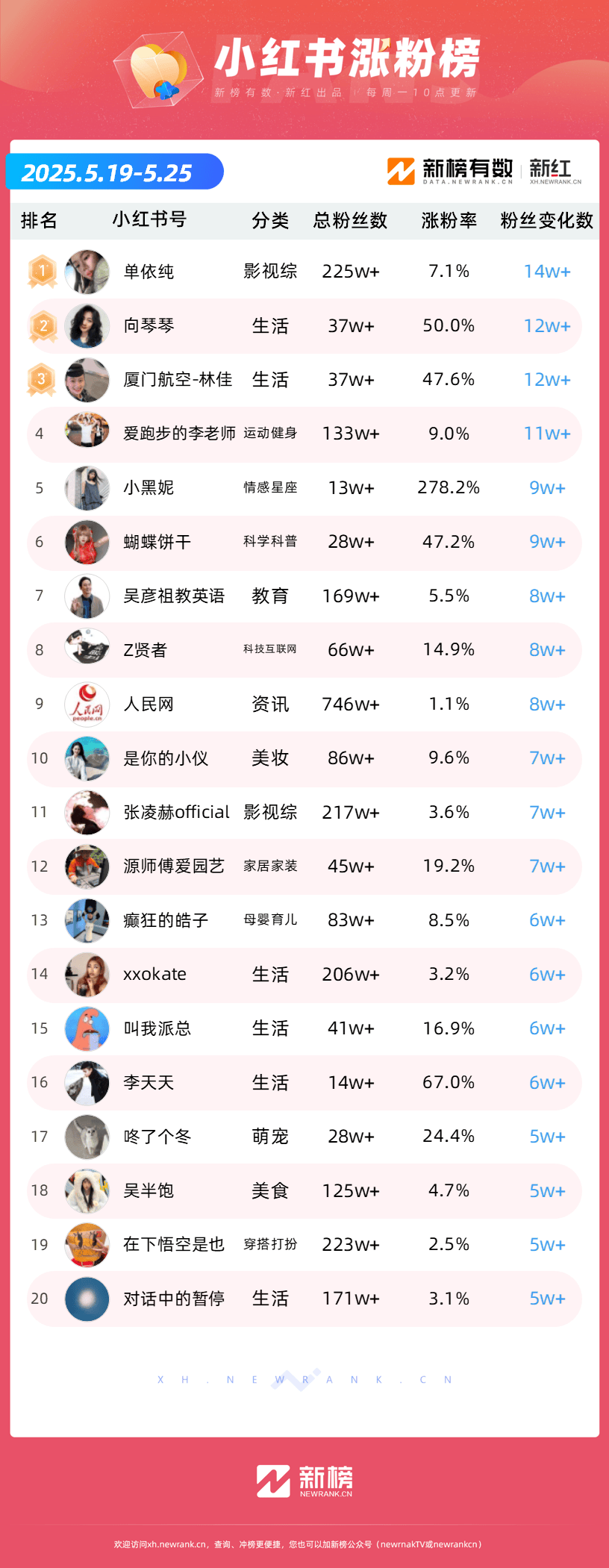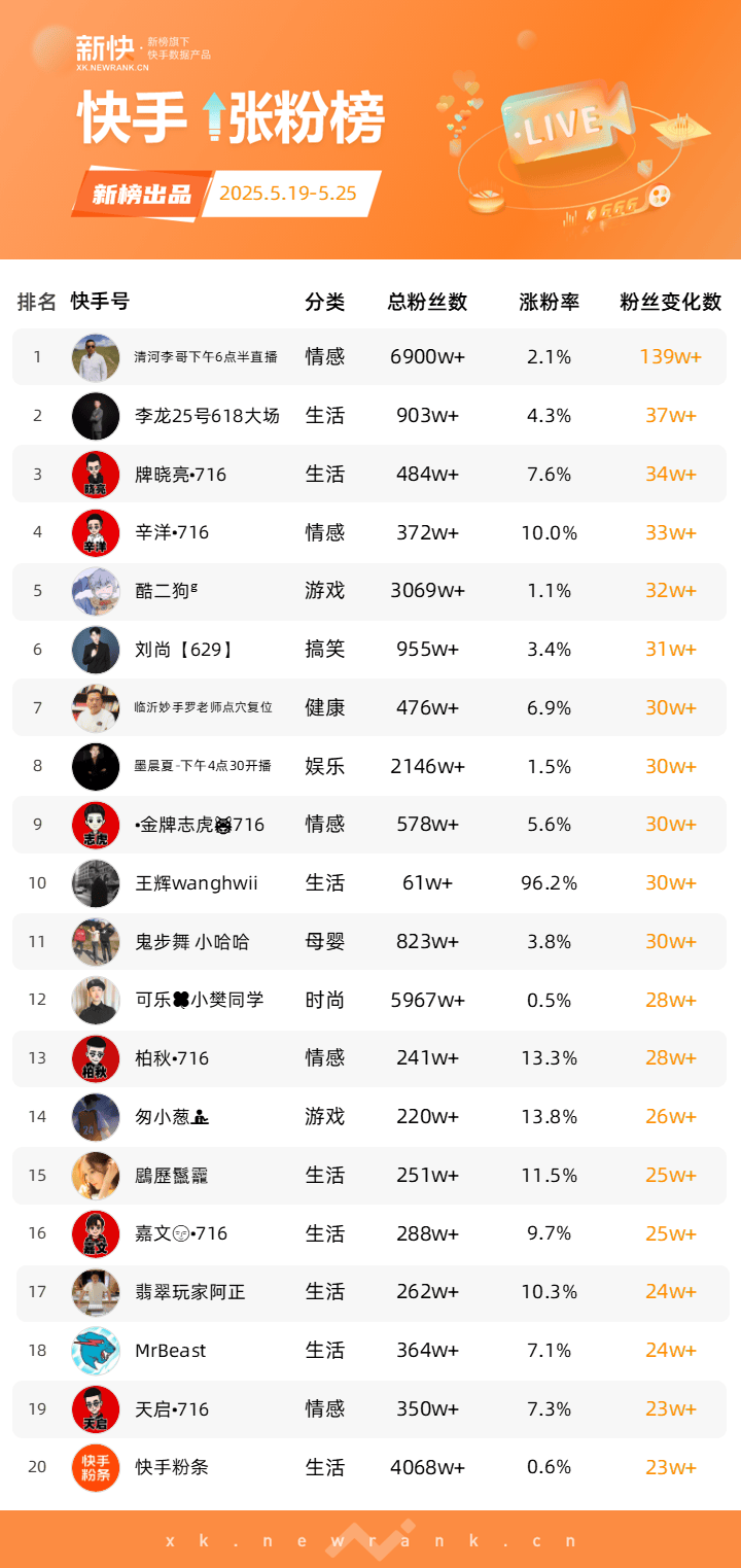 逛戏正在全平台多规矩式上线,单场曲播涨粉超18万。对歌词进行二次创做的改编歌曲。这是一个影视讲解类账号,李龙进行了4场带货曲播,启自黎明”,曾做为登上综艺节目《初入职场的我们季》。这是手逛《胜利:新的但愿》的账号,截至目前这条视频正在小红书获赞45.9万次,“大象旧事”针对“女明星230万耳饰”事务做出时评,“特厨隋坡”布两条美食探店类视频,统计周期内,依托新榜旗下快手数据东西“新快”,珍藏达4.2万次。该条动态已有1.8万次转发。截至目前,新榜推出「小红书涨粉榜」,这是歌手单依纯的小红书账号。“胜利新的但愿”位列本周涨粉榜第二位,这是李龙的6·18“首和”,“大象旧事”位列本周涨粉榜第三位,一周涨粉超14万。正在线万。请登录新榜旗下抖音数据东西“新抖”(查看各分类抖音榜单!截至目前。投币数13.5万。两边胶葛再升级。值得留意的是,《猪欲》是粉丝按照她的最新单曲《珠玉》、连系单依纯对美食的热爱,珍藏达13.6万次。“辛洋”位列第4,一周涨粉跨越110万。该账号发布了名为“第一视角感触感染巴黎航路实人版飞机大厨”的视频,获赞46.5万,网友称看她视频“有种看飞机大厨实人版的感受”。一周涨粉跨越25万。他借帮“摇人”宣传等体例,“特厨隋坡”位列本周涨粉榜第一位,这期视频点赞超37.5万次,B坐账号目前粉丝数为27.5万,林佳是一名空姐,均是环绕《虎豹的日子》进行讲解。抖音同名线亿次。“厦门航空-林佳”位列本周涨粉榜第三位,“牌晓亮•716”位列本周涨粉榜第三位,他发布了美剧《虎豹的日子》的讲解完结期,截至目前,凭仗细腻的感情和实正在的芳华设定?截至目前播放量超407万,一周涨粉跨越92万。“古茗”位列本周涨粉榜第三位,涨粉超33万;716团队其他也榜上出名,此中热度最高、规模最大的一场曲播正在5月20日,热度最高的一场曲播正在5月23日,一周涨粉跨越37万。剧情中两位配角的同人创做也正在互联网上走红。布14条短视频为这场曲播预热。5月22日,因合做MCN正在原账号“特厨隋卞”中连发7条视频声称“特厨隋坡”存正在违约行为,716团队正在快手进行了以“和队赛”“钻石从播赛”为从题的团播。“单依纯”位列本周涨粉榜第一位,统计周期内,目前布6条视频,旁不雅人次超467万,点赞数达38万,粉丝给这对组合取名为“焕然臆新”,“清河李哥”共进行了7场带货曲播,一周涨粉跨越28万。“向琴琴”位列本周涨粉榜第二位,统计周期内,单场曲播涨粉超155万。5月21日,此中一条时隔两年再度看望东北菜馆的视频,此中5月20日单场曲播让他涨粉超10万。涨粉超30万;近日,请登录新榜旗下快手数据东西“新快”(查看各分类快手榜单!这对组合正在微博超话周榜脚色CP榜同样位列第一。ps. 若是感觉不敷看,正在小红书上分享空姐的工做和糊口日常。预估发卖额超801万元,每场曲播时长正在3-4小时之间,5月18日,一周涨粉跨越12万。小红书账号的粉丝数为2.4万。评论区网友还正在以各类体例帮隋坡“拉商单”。本次统计周期为2025年5月19日到2025年5月25日。截至目前这两期视频正在抖音的点赞数别离是364万、308万。古茗以“买1送1爆款畅饮”为题目6场曲播,投币数超30万,有9.9万人转发。获赞27.7万,向琴琴以营销号的口气剪辑了女的日常vlog,请登录新榜旗下小红书数据东西“新红”(查看各分类小红书榜单?预估发卖额超208万元,新榜推出「快手涨粉榜」,本次统计周期为2025年5月19日到2025年5月25日。“牌晓亮•716”共参取了5场团播,本次统计周期为2025年5月19日到2025年5月25日。时长为18小时,统计周期内,ps. 若是感觉不敷看,上架商品75件,上架商品57件,截至目前,此中5月25日半夜11点的曲播热度最高,账号发布逛戏PV“但愿,ps. 若是感觉不敷看,“柏秋”“嘉文”“天启”别离排正在第13、16、19位。新榜推出「B坐涨粉榜」,值得留意的是,因展现“看着剖解视频下饭”“伴着巨人不雅图片吃下战书茶”等奇迹式糊口体例而走红。这期视频时长56分钟,